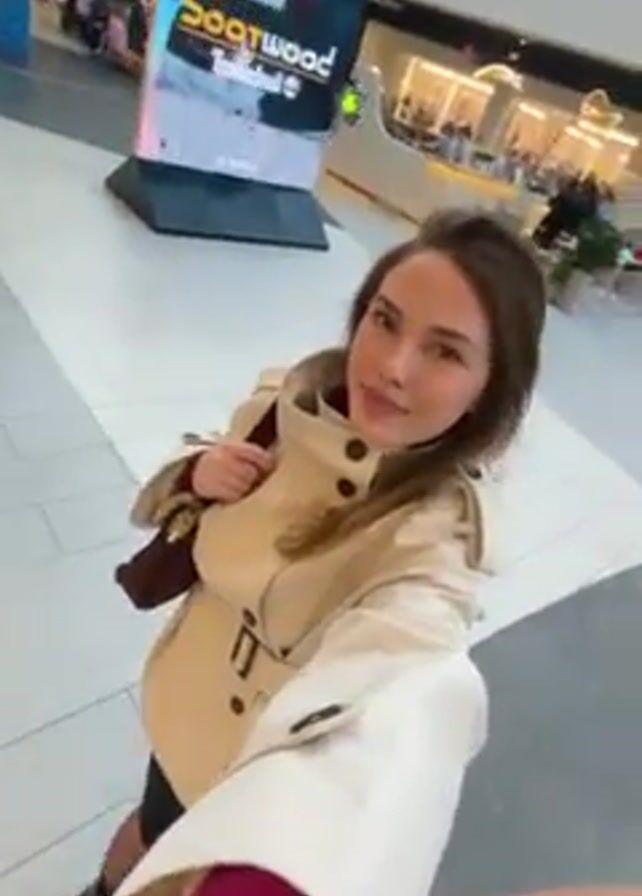 young woman standing in a mall, holding a camera and filming herself, presumably for social media. She is wearing a beige trench coat, a dark skirt, black stockings, and knee-high black boots. She has a burgundy bag over her shoulder. The mall has multiple levels, with various stores and advertisements visible in the background. She is smiling and turning her head to face the camera. The lighting is bright. Other people can be seen walking in the background.