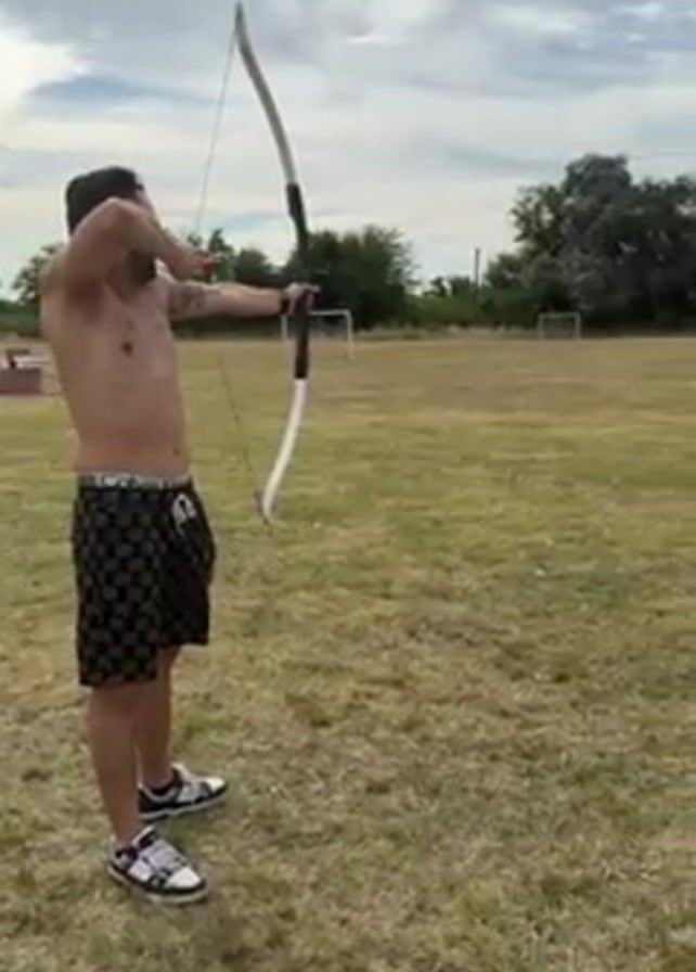 A man stands shirtless on a grassy field and shoots an arrow from a recurve bow toward a target. He is wearing black and white patterned shorts and matching sneakers. The target is green with a white, orange, and black bullseye. There are trees and soccer goals in the background under a cloudy sky. After the arrow is released, the man steps to the side, gesturing with his hands as if in explanation.