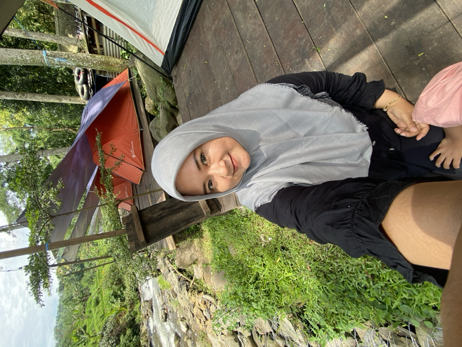 A woman in a hijab smiles at the camera. She is outside, beside a tent and a river. A small child, wearing pink, holds her hand. The woman is wearing a dark dress. The surrounding vegetation is lush green, with trees and grass. There is a wooden deck near the tents. The scene appears to be a camping or outdoor recreation setting.