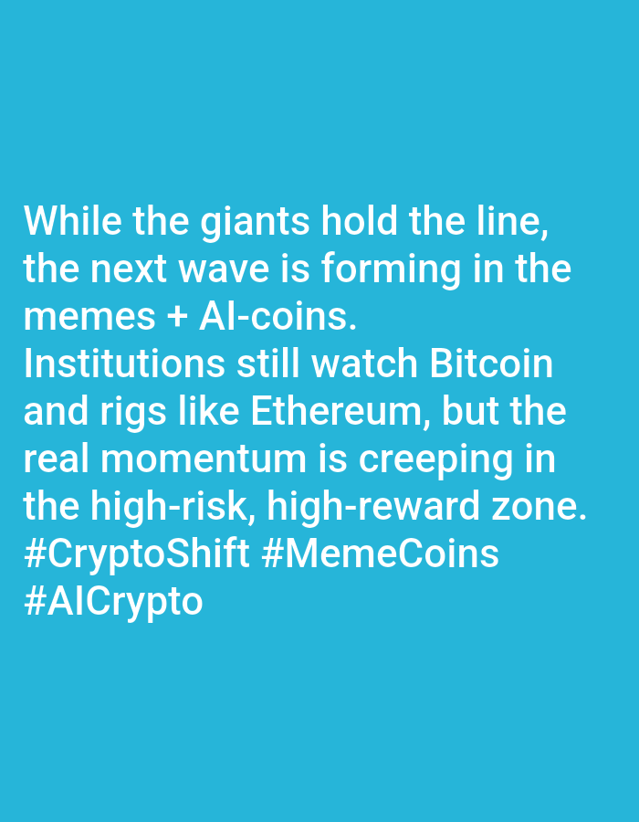 The image displays a digital graphic featuring white, sans-serif text against a solid teal blue background. The text, centrally aligned within the image frame, reads: "While the giants hold the line, the next wave is forming in the memes + AI-coins. Institutions still watch Bitcoin and rigs like Ethereum, but the real momentum is creeping in the high-risk, high-reward zone. #CryptoShift #MemeCoins #AICrypto". This digital scene contains no discernible physical location, including any specific area within Gimpo-si, South Korea. Furthermore, no individuals, physical subjects, objects, actions, interactions, or environmental details are visually depicted within this graphic.