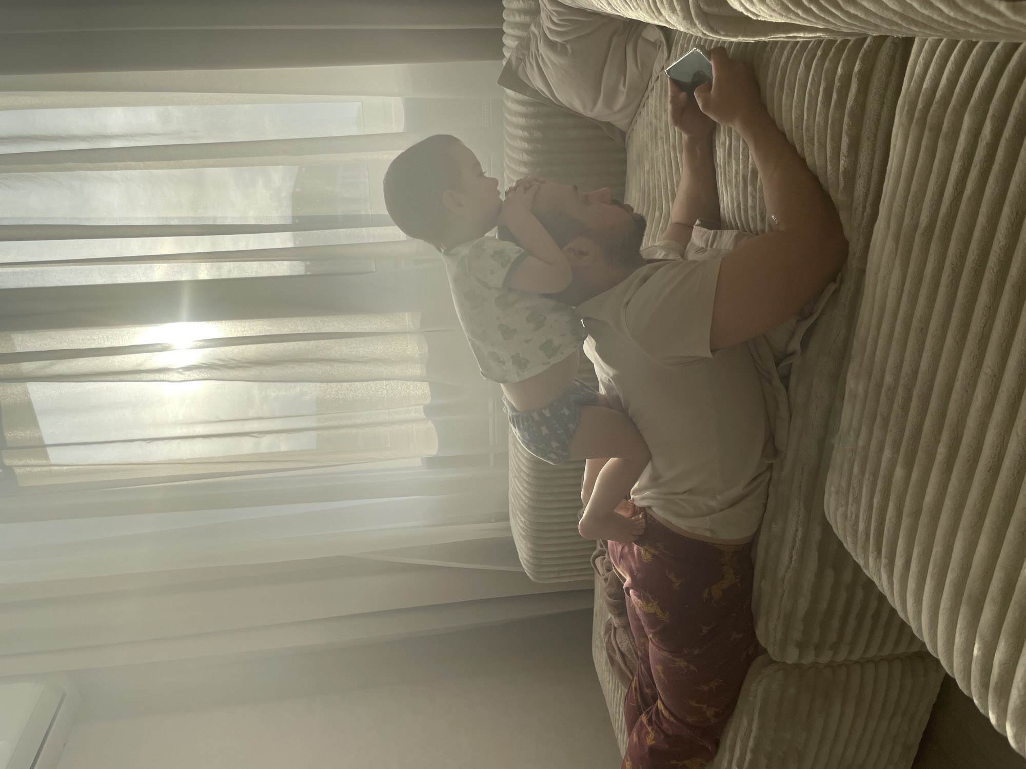 A man is lying on a beige corduroy couch, looking at his smartphone. A toddler is standing on his torso, embracing his face with both hands. The man is wearing a light-colored t-shirt and red pants with a pattern. The toddler is wearing a patterned t-shirt and shorts. The scene is brightly lit by daylight coming through a window covered by sheer white curtains. It is not possible to determine the location in the city of Izhevsk, Russia.