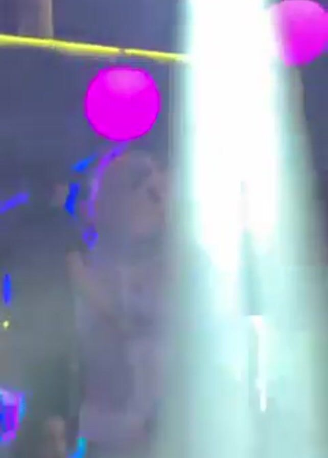 Here's a detailed description of the video: The video shows a mascot character dressed in white with a cartoonish face, seemingly at an event or party. The mascot has a tie and is standing among people, some of whom are interacting with it. A person in a black shirt adjusts the blue element on top of the mascot's head. The background is illuminated with neon lights and large pink orbs. There is a stage-like setup with various people walking around. The scene appears to be lively and the lighting creates a vibrant atmosphere.