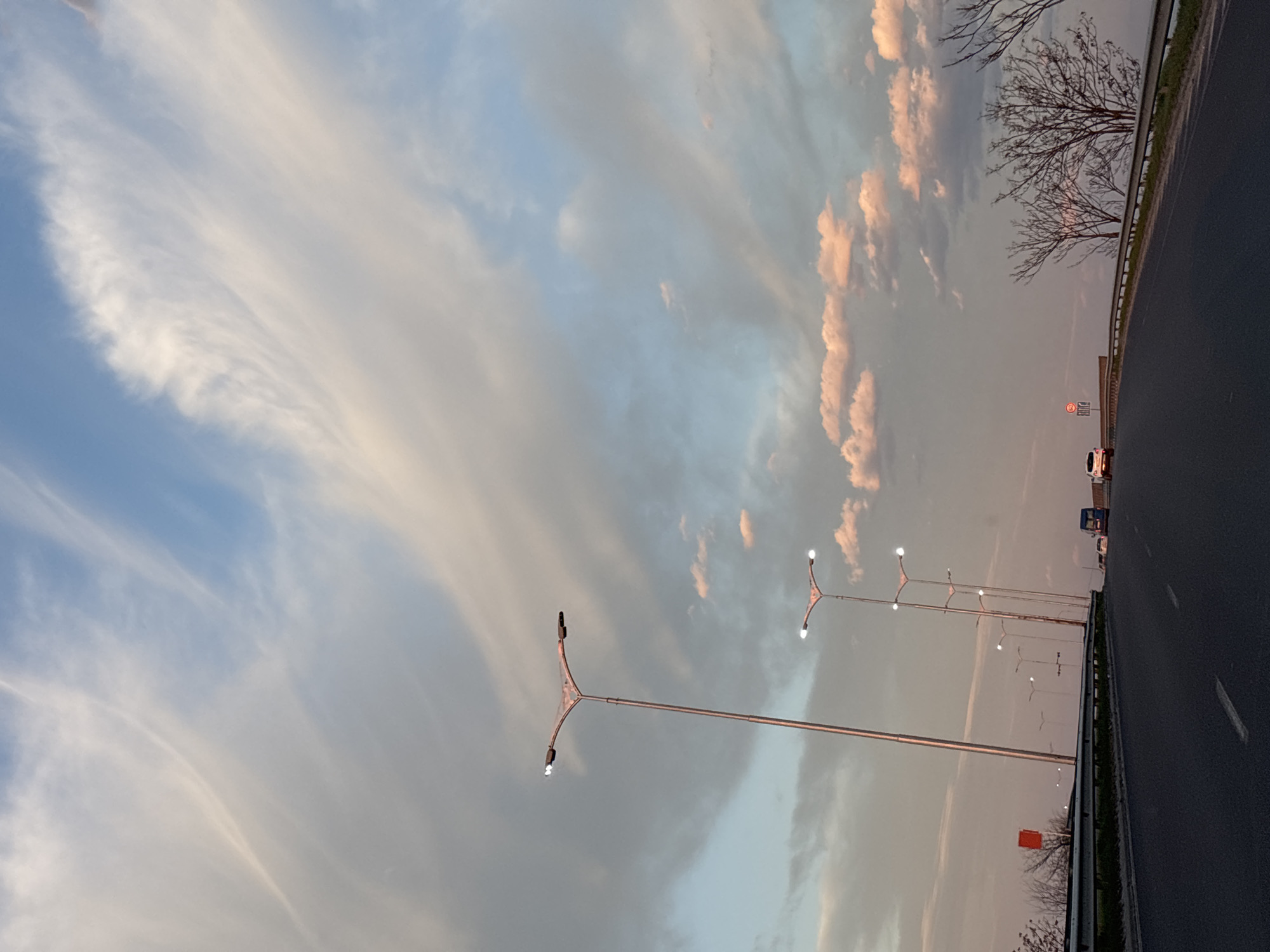 view of the sky and a road in Plovdiv, Bulgaria. The sky is filled with various types of clouds, including wispy cirrus clouds and some with a pinkish hue, suggesting it may be near sunrise or sunset. The road is asphalt, and along the roadside, there are lampposts. Bare trees are on the right of the frame. Traffic signs are visible near the road. There is some distant traffic visible.