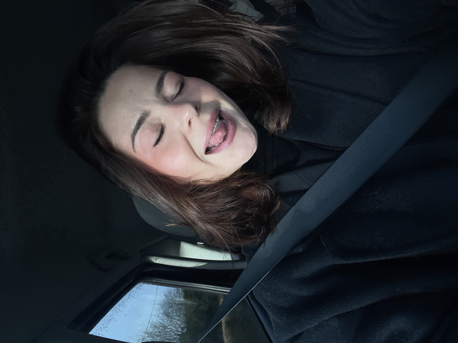 The image depicts a female individual seated in the passenger side of a vehicle, secured by a black diagonal seatbelt across her chest. She possesses shoulder-length dark brown hair, fair complexion with visible cheek blush and light pink lipstick. Her eyes are closed, and her tongue is partially extended, indicating a playful expression. She is dressed in a black turtleneck garment under a black overcoat. The vehicle interior is dark, and through the window on the left, bare trees are visible against a light sky, with minor flecks on the glass. The scene is identified as taking place in Carency, France.