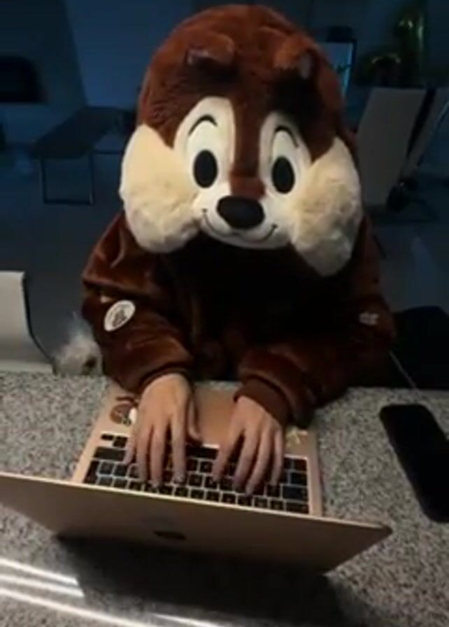 A person wearing a Chip (Chip and Dale) hooded onesie is sitting at a speckled gray countertop typing on a rose gold Apple MacBook. A smartphone is to the right of the laptop. There are some stickers on the laptop. The room appears to be dimly lit. There are chairs and decor in the background. The person's hands are on the keyboard and they are actively typing.
