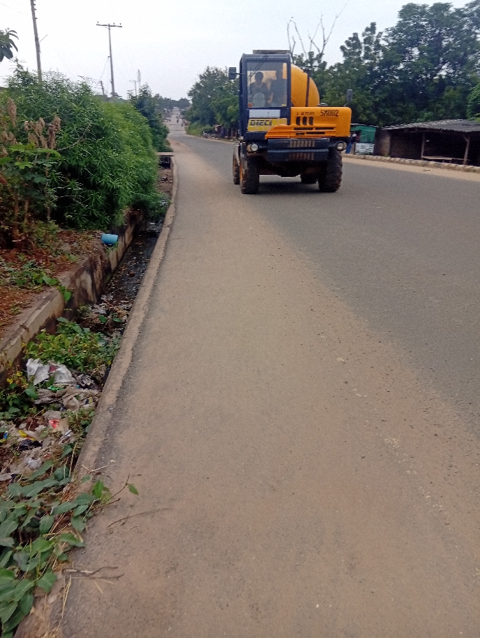 The image depicts a paved road in Ozuri, Nigeria, under an overcast sky. A yellow and black self-loading concrete mixer, identified as a DIECI L 4700 S700Z, is positioned in the mid-ground on the right lane of the road, moving away from the viewer. Two individuals are visible within the vehicle's cab. To the left of the road, a concrete-lined open drainage ditch is heavily clogged with stagnant water, dirt, and accumulated refuse, including plastic bags and bottles. Dense green vegetation and bushes grow along the bank bordering the ditch. Two utility poles with overhead lines are visible in the background along this side of the road. The asphalt road, appearing somewhat worn, recedes into the distance uphill. On the right side of the road, beyond the concrete mixer, a low, dark structure with a corrugated roof, possibly a shed or stall, and a lighter-colored structure are visible. Lush green trees form a dense backdrop further down the road. The overall scene indicates a roadside environment with infrastructure and signs of urban or semi-urban development and waste management challenges.