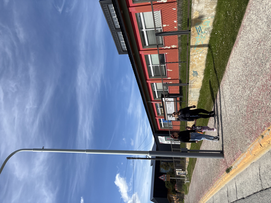 A red and black building stands next to a sidewalk where three people are standing. A mother and child appear to be walking, while another woman follows behind. A streetlamp and telephone pole are visible, stretching into a blue sky with wispy clouds. A grassy area and some signage appear in the background along the sidewalk. The scene is captured from a slightly upward angle.