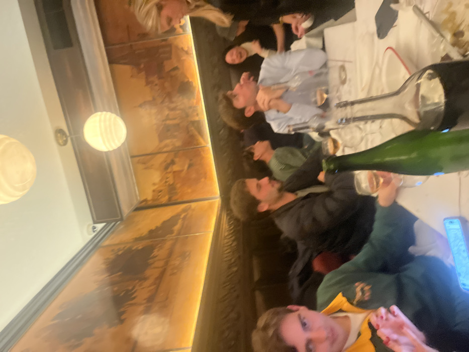 This image depicts a social gathering of approximately seven young adults inside a restaurant located in Paris, France
