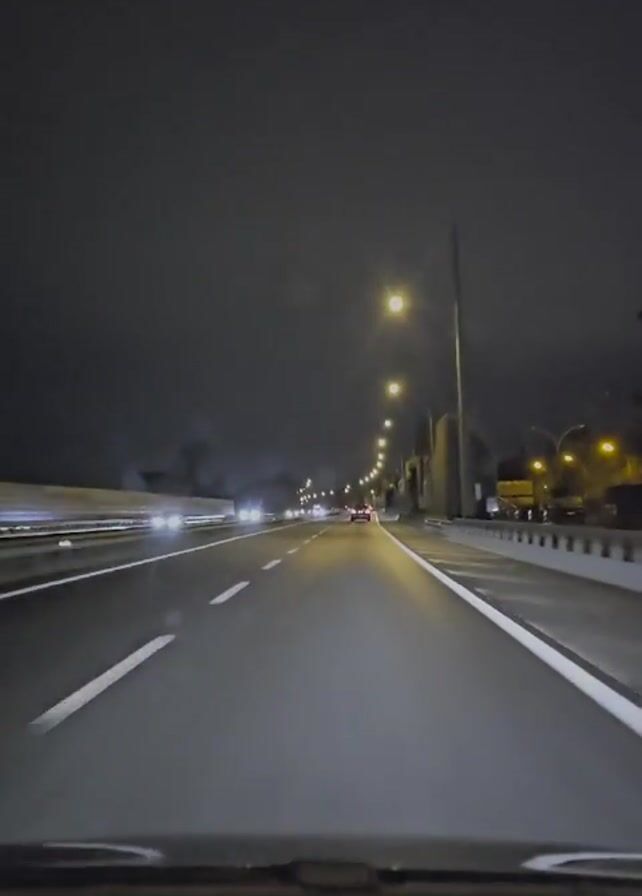 view from the dashboard of a car driving on a highway at night. There are other vehicles on the road, some with headlights visible in front of the car and some passing on the left. Streetlights illuminate the highway. On the right side of the road is a concrete wall. There is a visible wiper blade at the bottom of the frame, suggesting it might be raining. There is music playing inside the car.