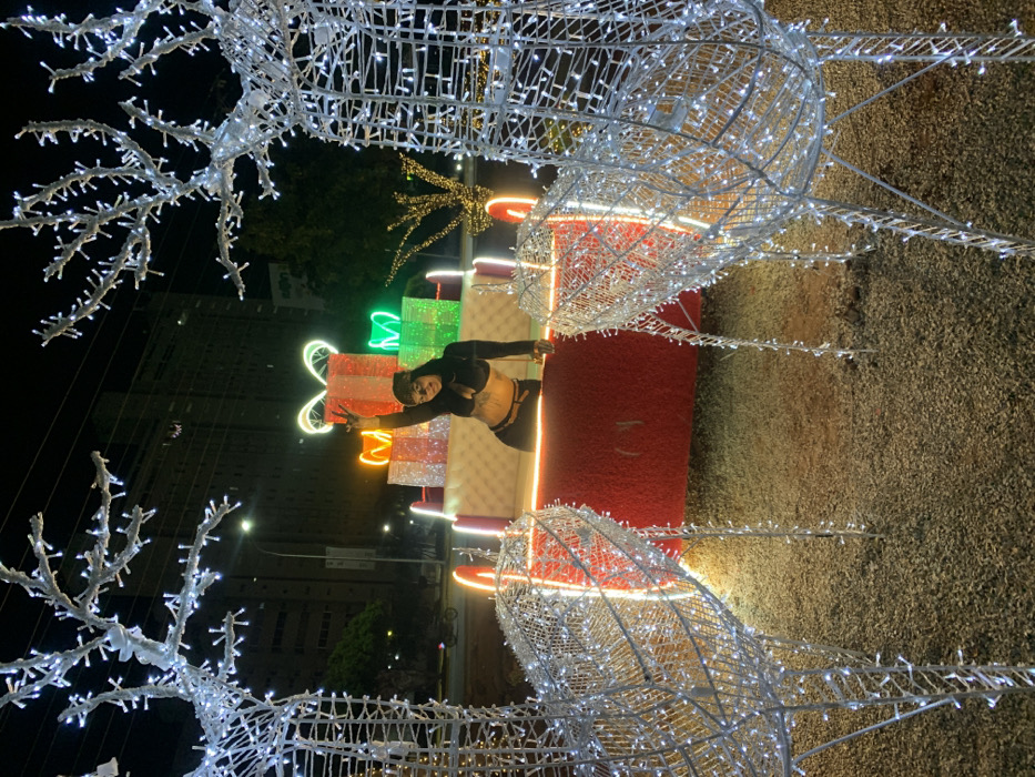 This image depicts an outdoor nighttime scene in Pampatar, Venezuela, featuring Christmas-themed decorations and one individual. In the foreground, two large, illuminated white wireframe reindeer structures, adorned with numerous small white lights, stand on a gravel-covered surface. These structures frame the central display, with their heads extending upwards on either side of the image. In the midground, a woman is positioned behind a large, illuminated sleigh structure. The sleigh is predominantly red with white accents and contains several glowing gift box decorations in various colors, including red, silver, and green, stacked behind the woman. The woman, appearing to be in her 20s or 30s, wears a dark long-sleeved crop top exposing her midriff, dark pants, and a dark cap. She faces the viewer, her left arm raised with two fingers extended in a 'V' gesture, and her right arm resting on the edge of the sleigh. The background consists of a dark urban environment typical of nighttime. Distant, multi-story buildings with faint internal lighting are visible, along with a blurred street and the indistinct shapes of trees or other foliage. The overall lighting emanates primarily from the illuminated decorations.