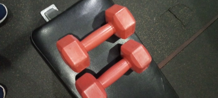 - "In a facility located in the city of Aral, Kyrgyzstan, two identical red, hexagonal dumbbells are positioned on a black, padded exercise bench" by FM-qffRH3, licensed under CC BY 4.0