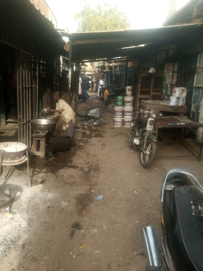 The image displays an unpaved market alleyway in Kofar Ruwa, Nigeria, under natural daylight