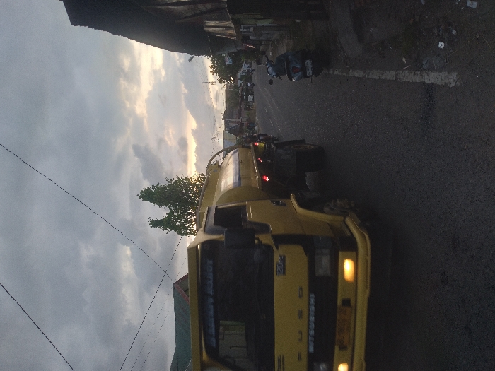 The image depicts an urban street scene in Lhokseumawe, Indonesia, captured during either dusk or dawn. The sky above is largely overcast with dark grey clouds, but a distinct band of lighter, yellowish-orange light is visible on the horizon. In the foreground and central left, a yellow Mitsubishi Fuso tanker truck is in motion, driving towards the viewer. Its headlights are illuminated, casting a yellowish glow. The truck's front grille clearly displays "FUSO" and "MITSUBISHI." A yellow license plate, typical for Indonesian commercial vehicles, is visible on the front bumper but is motion-blurred. Red taillights are active and visible on the rear portion of the truck's tank body. To the right, an asphalt road shoulder is visible, demarcated by a faded white line. A light-blue scooter is parked on this shoulder, facing away from the viewer. Adjacent to the scooter is a building with a dark, sloping roof and dark-toned, possibly weathered, siding. Further down the street, several additional motorcycles are visible in motion. On the left side of the frame, a building with a green-tiled or painted roof is partially visible. Multiple utility lines traverse the sky overhead. Scattered debris is present on the road shoulder near the parked scooter.