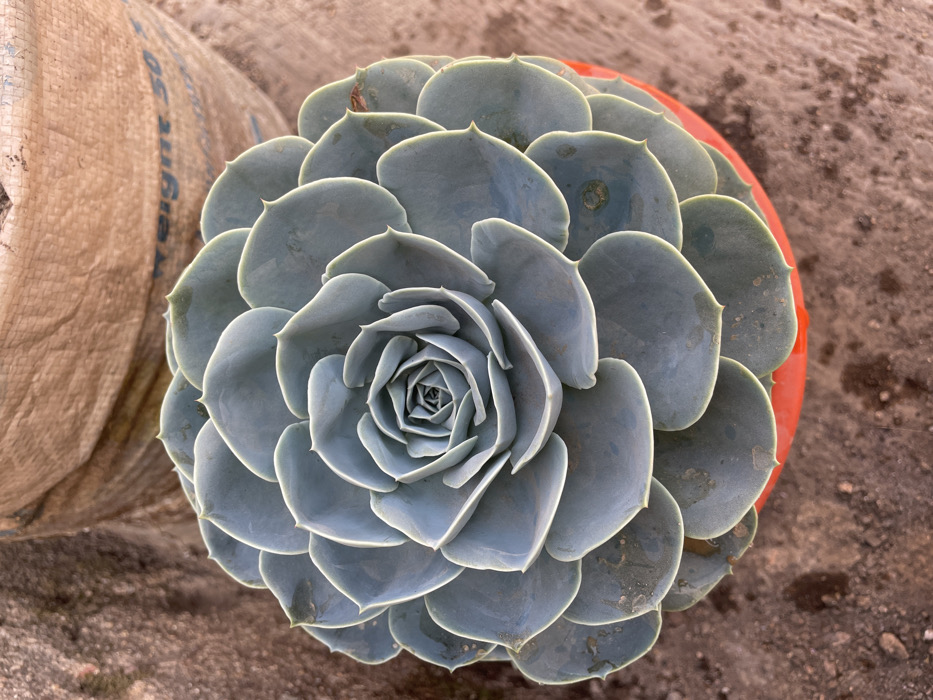 This image, taken in Gura Top, Nigeria, presents an overhead, close-up view of a pale blue-green succulent plant, specifically a rosette-forming type such as an Echeveria