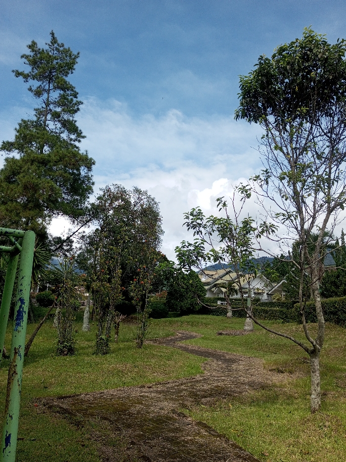 A park scene shows a grassy area with a path curving through it. Various trees frame the view, including a tall pine and deciduous trees with sparse leaves. In the background, a white building with a distinctive roofline is partially visible behind hedges. The sky is blue with scattered clouds, and a green metal structure stands in the foreground.