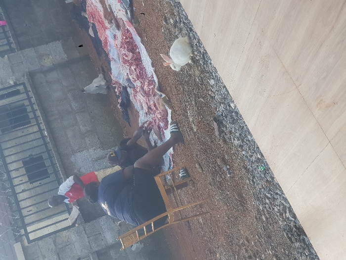 The image depicts an outdoor meat processing scene in Abuja, Nigeria