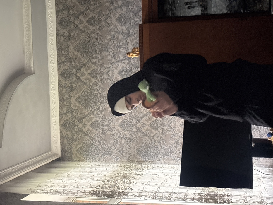 The image depicts an indoor residential scene in Durgena, Georgia. A single individual, appearing to be a young male, stands centered in the frame, facing slightly right. He wears a white beanie under a black hooded sweatshirt and black sweatpants. The individual holds a light brown, circular object, possibly a bun or small cake, in both hands, accompanied by a small, light green plush toy positioned atop the circular object. To the left, a window covered by a translucent white curtain with intricate patterns allows natural light into the room. A large, dark-screen television is visible in the lower-left background. To the right, a tall, dark wooden cabinet with glass doors stands, featuring a golden-colored decorative item on its top surface. The walls are covered with wallpaper displaying a repeating grey and beige damask pattern. The ceiling is white with decorative crown molding along the perimeter.