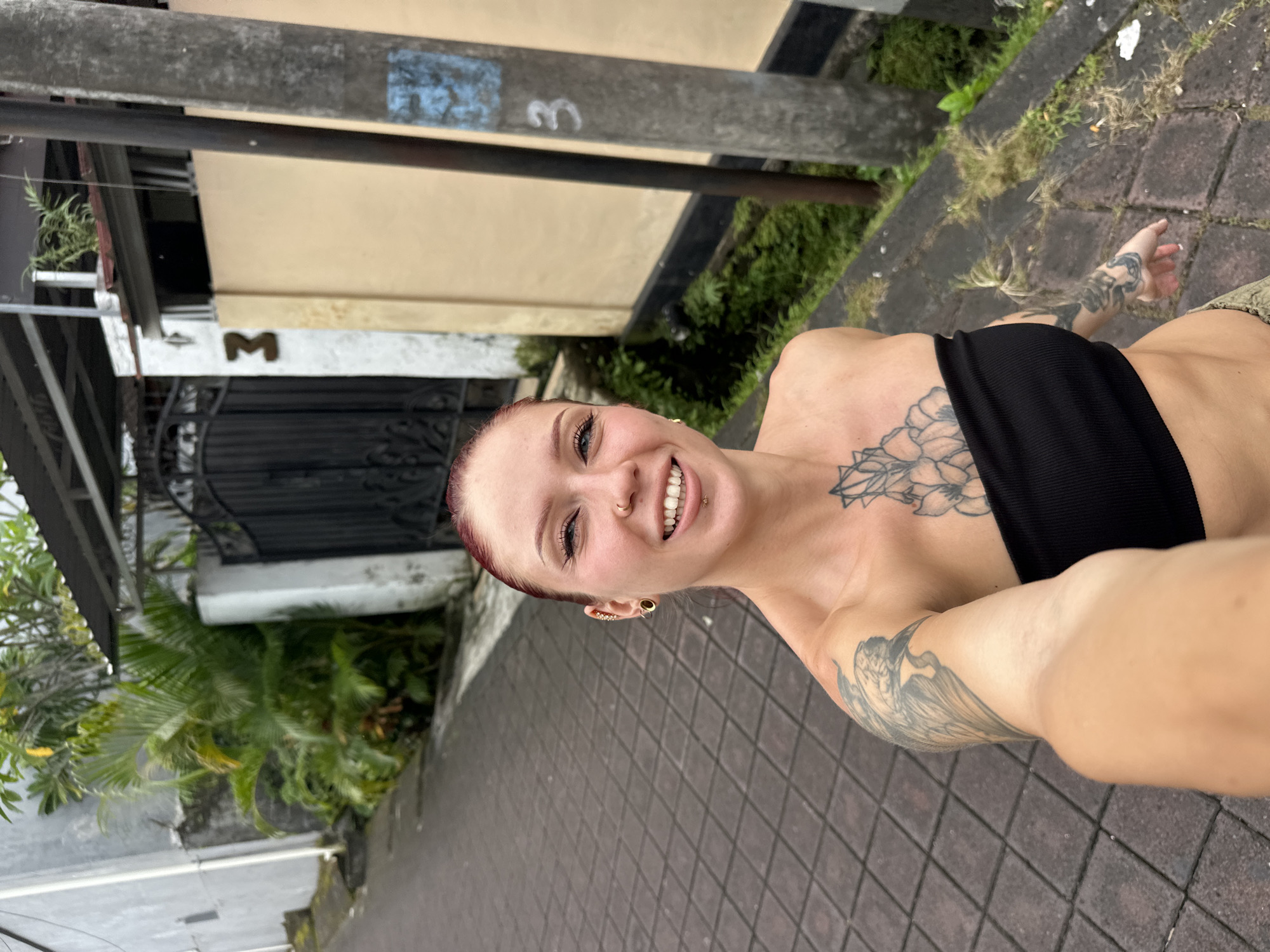 The image displays a single female individual positioned outdoors on a paved street in Kerobokan, Indonesia. The individual, appearing to take a selfie, faces the camera with a smiling expression. She has reddish-brown hair, blue eyes, a nose stud in her left nostril, a philtrum piercing, a stretched left earlobe with a tunnel, and multiple helix piercings. She wears a black strapless crop top and a portion of olive-green trousers. Visible tattoos include a floral design on her upper left chest and a bird-like figure on her upper left arm. The background consists of a paved street constructed from reddish-brown interlocking pavers. To the left, a light grey building is visible, alongside dense tropical foliage. To the right, a cream-colored building facade with a dark lower trim runs parallel to the street. A dark, ornate metal gate is present, flanked by a white pillar bearing the number "3." A grey utility pole with faded blue markings and a painted number "3" stands further to the right. Lush green foliage and overgrown grass are present along the edges of the paved area and behind the gate. The scene is illuminated by natural daylight.