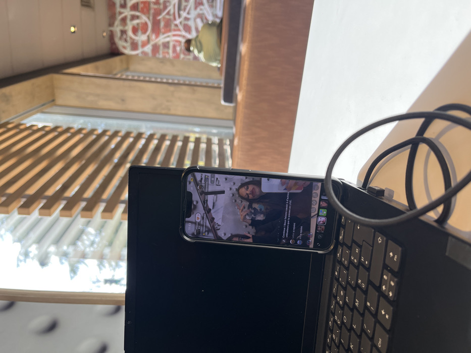 The scene is set inside a public establishment, likely a cafe or restaurant, in Oberhausbergen, France. A dark-colored laptop with an inactive screen and an AZERTY keyboard is positioned on a light-colored table in the foreground. Resting vertically on the laptop's keyboard, leaning against its screen, is an iPhone in a clear protective case. The iPhone's screen displays a live video stream at 11:43. Visible on the stream are two females; the foreground subject, with dark hair, is smiling and features a mustache-like filter, holding another phone to capture a selfie within the live broadcast. French text on the screen reads, "Continue ! Nous faisons savoir à d'autres utilisateurs que tu passes en LIVE," and indicates "Lutus a rejoint" and "Une a rejoint" as viewers. A coiled black cable lies on the table in front of the electronic devices. The background features a large window with horizontal wooden blinds, admitting bright daylight. To the right of the window, a wall displays a red brick pattern adorned with white abstract graffiti. In the mid-ground, a person wearing a light green hooded top is seated with their back to the camera on a brown upholstered booth.