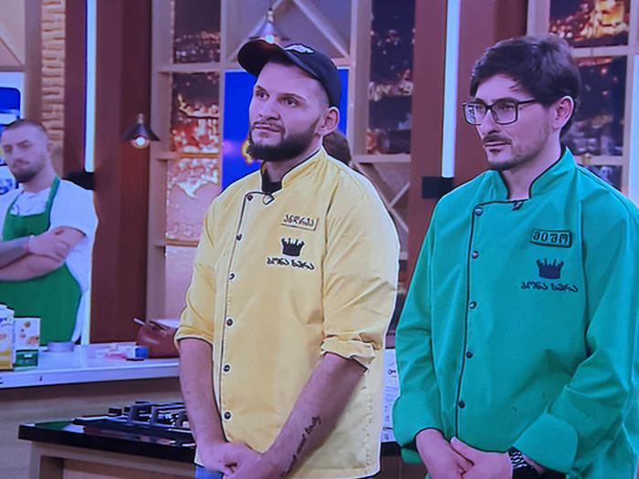 The image depicts three males in a brightly lit studio setting, presented as a kitchen environment, located in the city of Colombes, France. In the foreground, two men stand side-by-side, facing generally forward. The man on the left wears a yellow chef's jacket with black buttons, a black collar, and a black baseball cap. He has a dark beard and mustache and is looking slightly to his right. His jacket features Georgian script, including "SERGI" (სერგი) above a crown logo, and "MASTERCHEF" (მასტერშეფი) below it. His hands are clasped in front of him. To his right, the second man wears a green chef's jacket with black buttons and collar. He has dark hair, glasses, and a neatly trimmed mustache and beard. He looks directly ahead, and his jacket also displays Georgian script, with "ADAM" (ადამ) above a crown logo and "MASTERCHEF" (მასტერშეფი) below it. His hands are also clasped in front of him. Partially visible in the background on the left is a third man with a beard, wearing a white t-shirt and a green apron, standing with his arms crossed, observing the scene. The immediate foreground features a black countertop with what appears to be a built-in stovetop or cooking range. Further back on the left, a counter holds various kitchen items, including a white carton and a small red bowl. The background is a stylized studio set, featuring illuminated shelving units with segmented warm lights, some resembling city lights, and vertical light strips, contributing to a modern television production aesthetic.