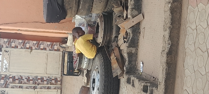 A young boy in a yellow shirt works inside a stack of tires and metal parts, possibly from a truck. The setting appears to be outdoors, near a building with a window and some sort of wall. A generator sits close to the boy and the tires. The ground is a mix of concrete, dirt, and paving stones.