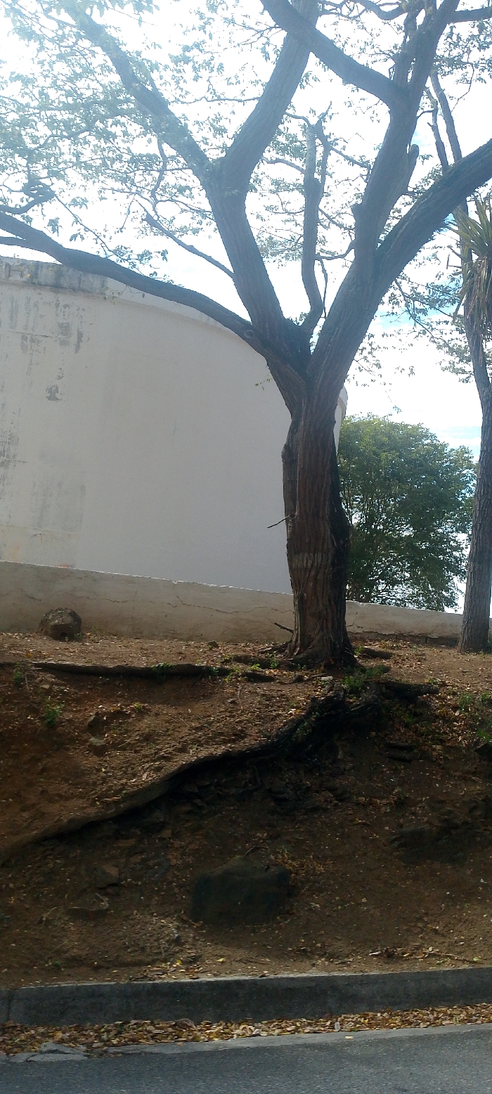The image depicts an outdoor, daylight scene in La Asuncion, Venezuela. A large, mature tree with a thick, textured brown trunk and numerous prominent branches dominates the central and upper frame, its sparse green foliage silhouetted against a bright, overcast or hazy sky. To the left and behind the tree is a light-colored, likely off-white or light gray, concrete or stucco wall, exhibiting minor surface discoloration and wear. The ground beneath the tree and along the wall is a dry, brown dirt slope, from which several large tree roots are exposed. Small patches of green vegetation and scattered dry leaves are visible on this slope, alongside several dark rocks. The bottom of the frame shows a dark gray asphalt road, separated from the dirt slope by a gray concrete curb. Accumulations of dry leaves are present along the curb and on the adjacent road surface. A portion of another tree trunk is visible on the far right. No individuals, overt actions, or interactions are present in the scene.