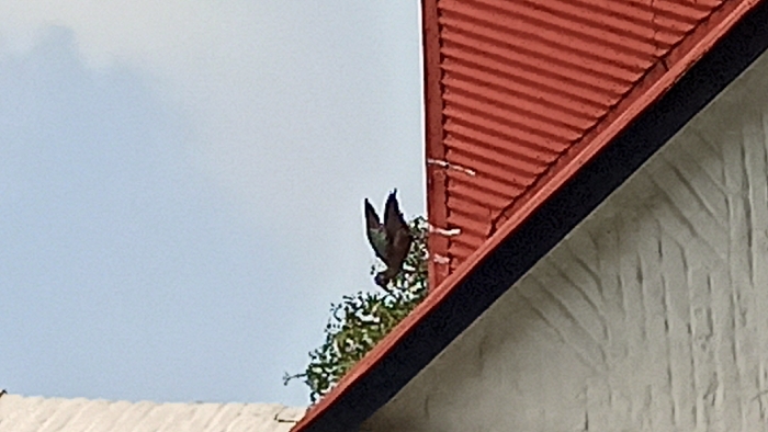 A bird, likely a hawk, is perched on a rooftop covered in greenery. The bird faces downward with its wings slightly spread. The rooftop has red roofing tiles and a white wall with distinct vertical lines. The sky is partially visible in the background, suggesting a daytime scene.