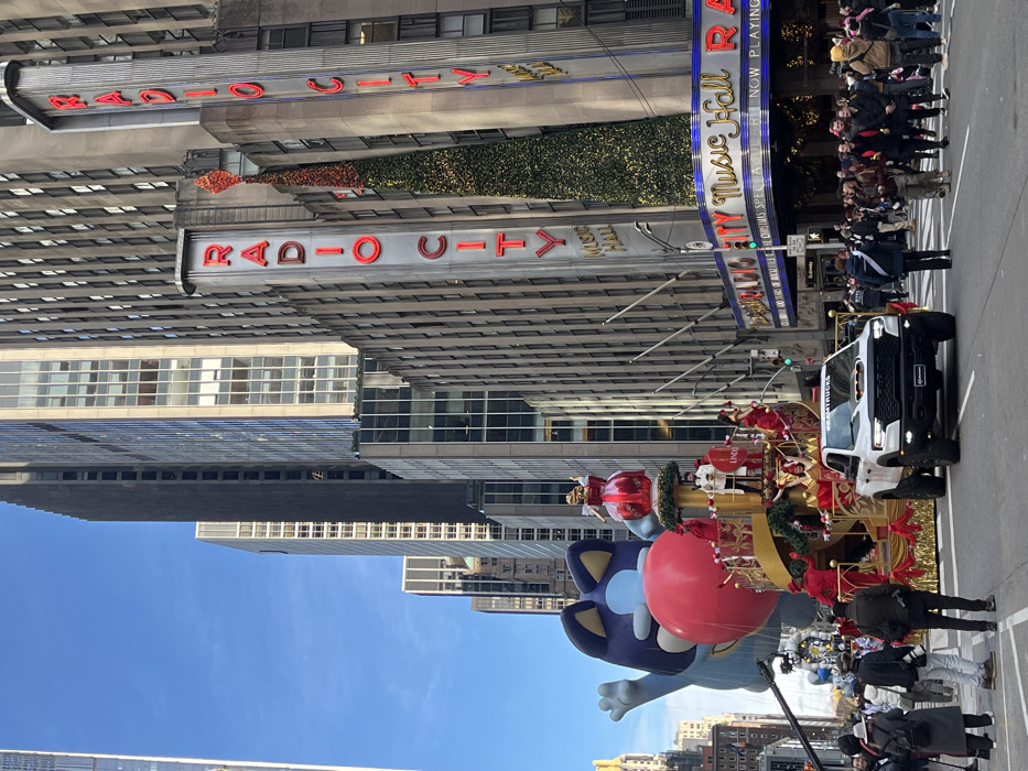 A scene from a parade shows a "Bluey" character balloon next to a float decorated with people dressed in red. Buildings tower over the parade route, including Radio City Music Hall with its marquee illuminated. Spectators line the sidewalks, and a white pickup truck branded with "Dreamtrucks" follows the float. The sky is partially clear and blue.