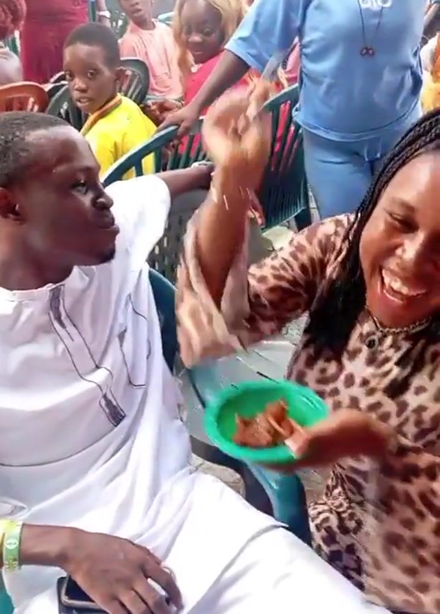 woman in a leopard print dress kneeling to feed a man in white attire with food from a small green plate. They are both seated outdoors in green plastic chairs, surrounded by other people, some of whom are also seated. After the food is offered, the woman throws her arm up in celebration with a large smile and cheers can be heard. The man looks down at his lap after being fed, where he is holding a cell phone. There are other chairs and tables visible in the background.