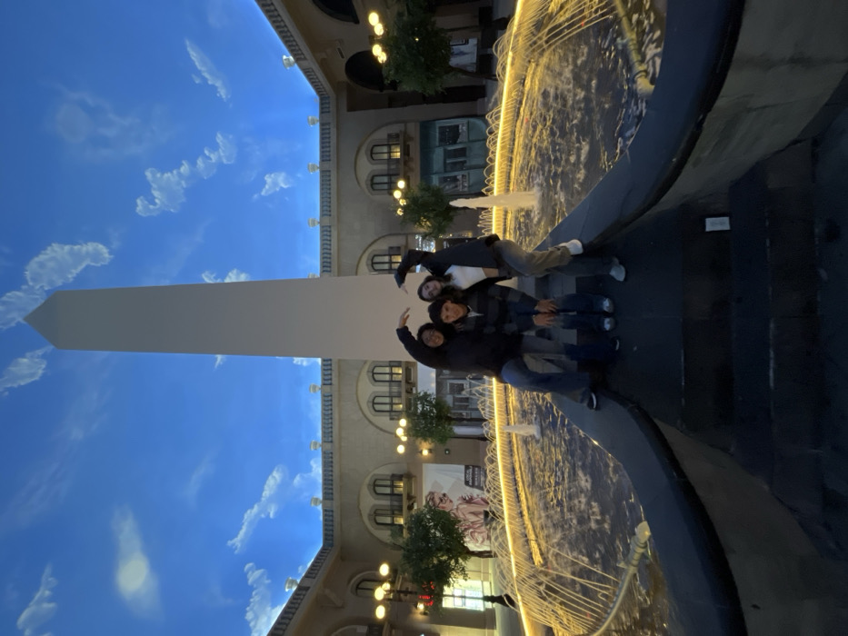 Four people pose near a water fountain and a tall, rectangular obelisk. The fountain is adorned with illuminated strands. The architecture in the background features arched windows and decorative lighting. The sky above the obelisk is blue with scattered clouds. The photograph is taken in an outdoor setting during dusk or evening.