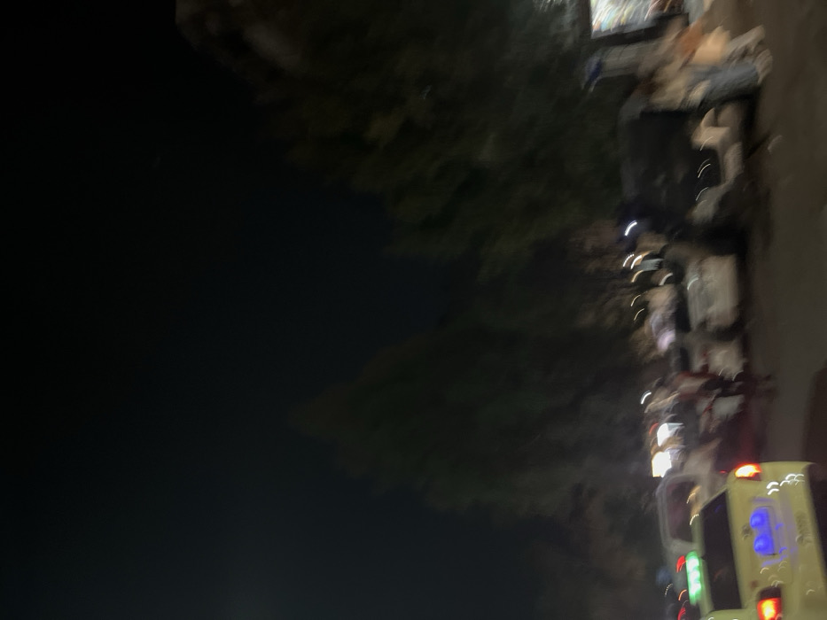A blurry, nighttime scene featuring a dark expanse of sky on the left. The right side shows a street with buildings illuminated by dim lights. An emergency vehicle with flashing lights is visible at the bottom right. Dark trees or foliage appear above the buildings, adding to the overall low-light atmosphere.