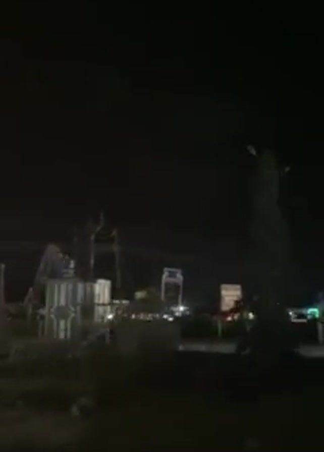 n outdoor scene at night. A statue stands prominently on a circular base in the center of a roundabout. The roundabout is surrounded by roadways and illuminated by streetlights. The statue appears to be of a person, though details are indistinct. Surrounding the statue are plants or shrubbery and several road signs. A tall tree, possibly a pine, is on the right side of the frame. Traffic moves through the roundabout. The lighting is poor, making the scene difficult to discern. A white sign is partially visible in the foreground, obscuring some of the view.