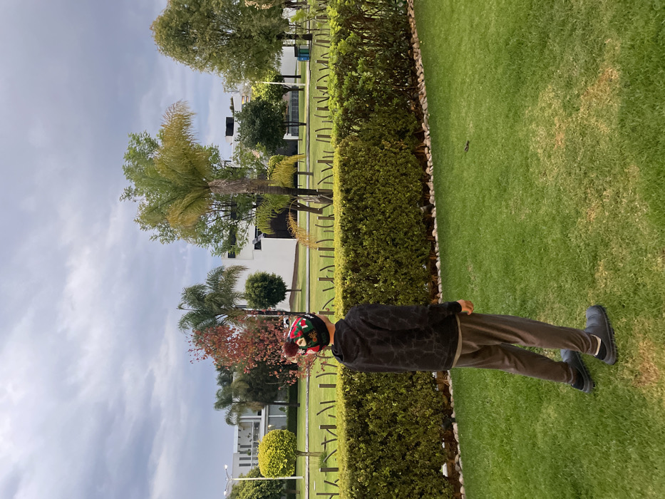 A person stands on green grass next to a neatly trimmed hedge. They wear a dark patterned jacket, tan pants, and dark shoes. A colorful hat adorns their head. Behind the hedge is a manicured landscape featuring various trees, including palms, and white buildings under a cloudy sky. The grass extends into the distance on the right side of the frame.
