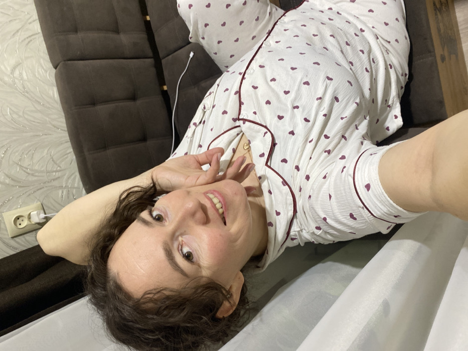 An adult female is depicted lying on a dark brown, tufted sofa within an indoor residential setting in the city of Ольховка, Russia