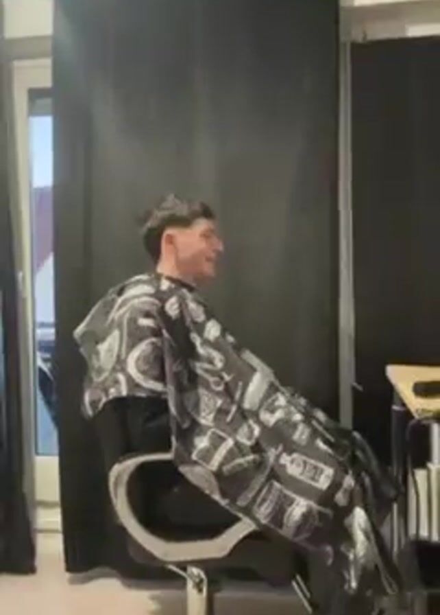 A young man with dark hair and braces is sitting in a black barber chair, wearing a black and white cape with barber tool illustrations