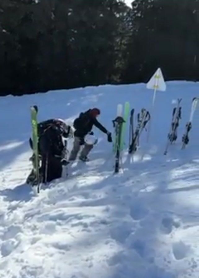 A person wearing winter clothing attempts to walk uphill through deep snow. The person has on a helmet and is carrying skis and poles, and sinks into the snow. Another person standing nearby walks closer and appears to photograph the first person with a phone. The first person stands back up and retrieves their skis, poles, and helmet. Both people are standing on a snow-covered slope, in front of a snow-covered hill in the distance. Evergreen trees line the top of the hill.