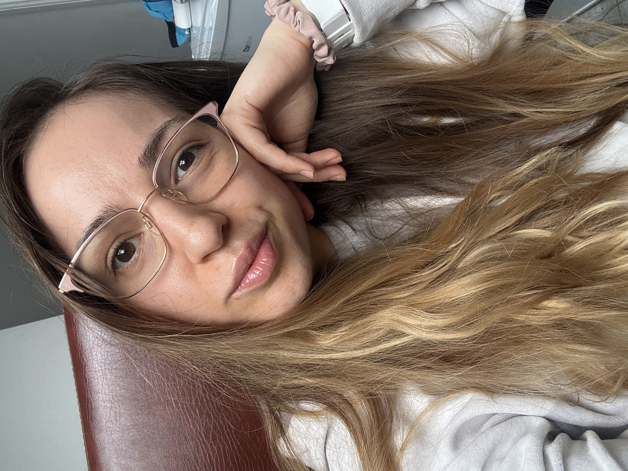 The image depicts a young adult female, appearing Caucasian, captured in a medium-close-up selfie in an indoor setting. She has long, wavy hair, which transitions from a dark brown at the roots to a lighter blonde-brown or ombré through the lengths. She wears light-pink framed prescription eyeglasses. Her lips are slightly parted and exhibit a glossy finish. Her head is tilted slightly to the viewer's left, and her left hand is positioned under her chin, with her index and middle fingers resting against her lower cheek/jawline. A light pink fabric scrunchie is worn on her left wrist, positioned above a white rectangular device, possibly a digital watch or fitness tracker. She is dressed in a light-colored, likely white or light grey, long-sleeved garment, appearing to be a sweatshirt. She is seated or leaning against a dark reddish-brown, textured surface consistent with a leather or faux-leather chair back, visible behind her left shoulder and head. In the background, to the upper right, a grey wall or vertical surface is visible alongside a light-colored, possibly plastic, storage unit or container, which is partially obscured and bears the faint text "con...". The specific location within the city of Reading, United Kingdom, cannot be determined from the visual information presented in the image.