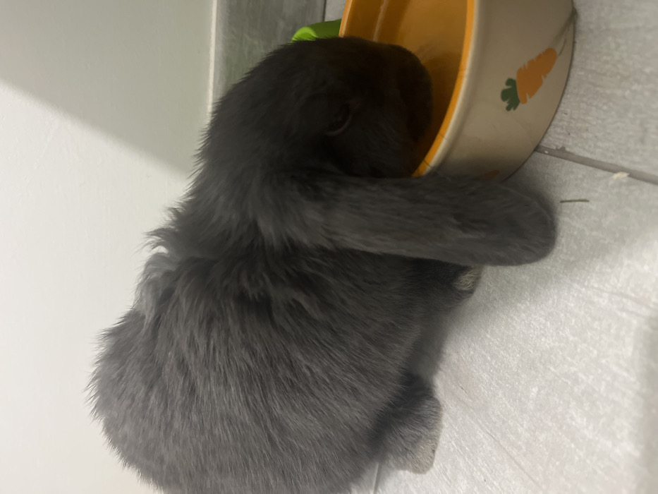 - "A gray bunny with lop ears is eating from an orange bowl decorated with a carrot" by FM-PwRFu2, licensed under CC BY 4.0