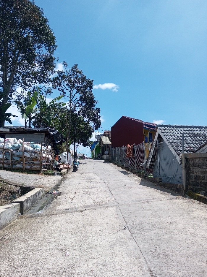 This image depicts an outdoor scene on a concrete road in the city of Tagtse Tashidingkha, Bhutan, under a clear blue sky with minimal scattered white clouds. The road, which appears to be sloping uphill and shows visible cracks and patches, occupies the central and lower frame, leading into the distance. On the left side of the road, a concrete drainage channel runs parallel to the path. Beyond it, a makeshift structure made of wood encloses a large stack of numerous white sacks. Behind this, lush green trees, including banana plants, are prominent. A dark-colored motorcycle is parked further up the road on the left, near the base of a utility pole. A small, partially obscured figure, possibly a person in a sitting or stooping position, is visible near the stack of white sacks. On the right side of the road, a low concrete block wall marks the edge of a property. Behind this, the gray-tiled roof of a building is visible, followed by a red-walled house with a matching red roof. Clothes, appearing to be blankets or textiles with striped patterns, are hanging on a fence in front of the red house. Further along the road on the right, several other residential buildings, painted in colors such as yellow, green, and blue, line the street. No other people or active interactions are discernible within the frame.