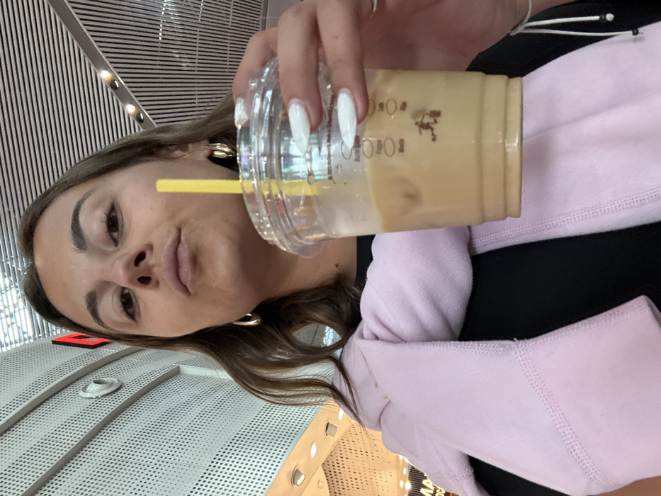 An indoor photograph shows a female subject from a low-angle perspective, facing the camera with a slight pout. She has brown hair and wears gold hoop earrings. Her attire consists of a black top and a light pink sweatshirt tied over her shoulders. Her left hand, featuring long white artificial nails, holds a clear plastic cup containing an iced coffee with a yellow straw. The cup bears a logo depicting a stylized figure with luggage. The background reveals a modern, spacious interior characterized by light-colored perforated wall or ceiling panels and linear overhead lighting. This architecture, combined with the coffee cup branding often found in travel hubs, identifies the location as Istanbul Airport, which is situated in the Arnavutköy district of Turkey.