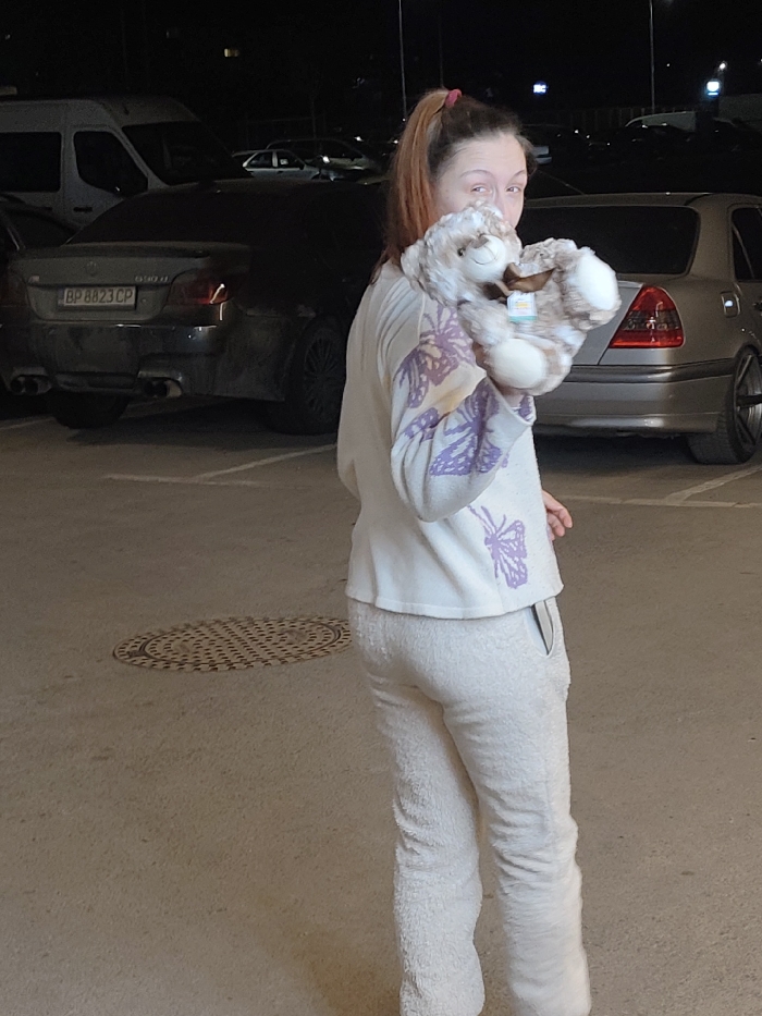 The image depicts a nighttime scene within a paved parking area in Vratsa, Bulgaria. A female individual stands prominently in the center-right, positioned with her back partially towards the viewer but turning her head to look towards the camera. She has light brown hair tied in a ponytail with a pink hair tie. She is wearing a light-colored, long-sleeved top adorned with purple butterfly patterns on the sleeves and front, paired with matching light-colored, textured, possibly fleece, trousers. She holds a brown and white plush animal toy, possibly a bear, in front of her face, partially obscuring her features; a light-colored tag is visible on the toy. In the background, behind the individual, a dark grey sedan (likely a BMW) is parked to the left. Its Bulgarian license plate, "BP 8823 CP", clearly identifies its registration to the Vratsa region. The vehicle appears dirty and features quad exhaust tips. To the right of this sedan, a lighter-colored car (possibly a Mercedes-Benz) with aftermarket wheels is also parked. A white van is partially visible on the far left edge of the frame. The ground is paved, and a circular, patterned metal manhole cover is visible on the concrete surface to the left of the individual. The overall environment is illuminated by artificial light sources, casting some shadows.