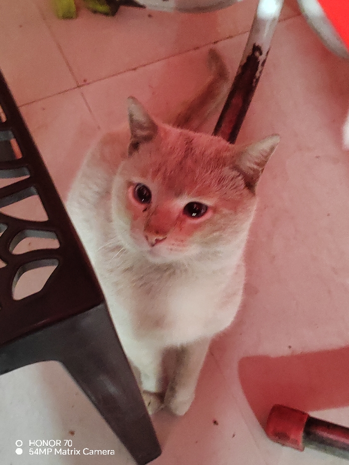 An off-white cat sits amidst furniture parts on a light pink tile floor. The cat has light orange coloring on the top of its head and back. It stares up with dark eyes. There's a dark smudge near its right eye. A dark chair leg is on the left side of the frame, and a red-capped chair leg is visible on the right. A chrome chair leg appears behind the cat. A camera watermark is in the lower left corner.