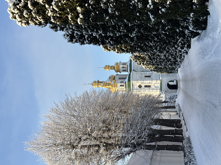 A winter photograph depicts the Gate Church of the Trinity within the Kyiv Pechersk Lavra complex in Kyiv, Ukraine
