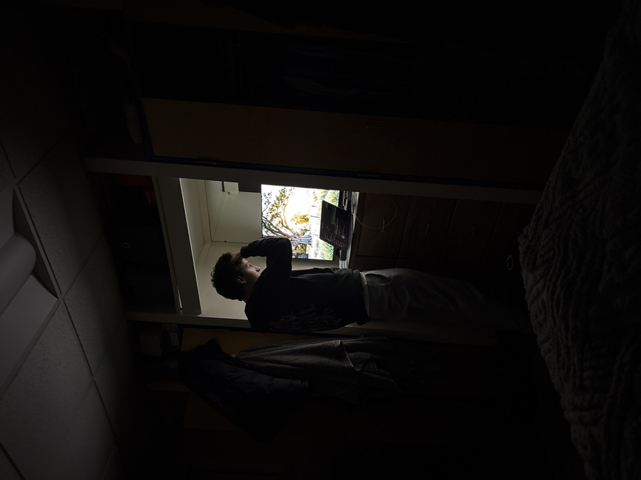 - "A dimly lit room contains a man lying down, looking at a computer screen" by FM-5oJwf2, licensed under CC BY 4.0