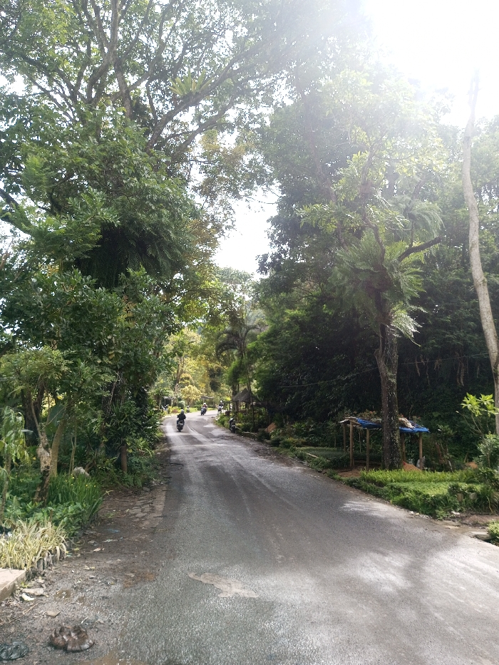 A wet, gray asphalt road stretches into the distance, lined with lush greenery and tall trees that meet overhead, creating a tunnel-like effect. Sunlight filters through the canopy. Two motorcycles are seen on the road. A small, wooden structure with a blue tarp roof sits to the right of the road, adding a touch of human presence to the natural scene.