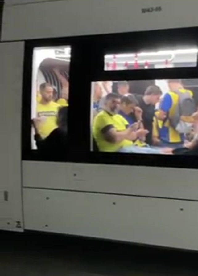 side of a white train or tram as it moves along a track. Inside the train, passengers wearing yellow shirts are visible through the windows. The train is full, and people are standing and sitting. The camera is stationary, capturing the train as it passes by.