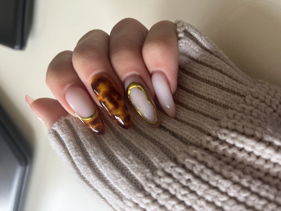 A human left hand is presented, partially clad in a ribbed, light beige knitted sweater sleeve that covers the wrist. The fingers are slightly curved. The nails are elongated, with an almond or stiletto shape, and feature a multi-patterned manicure. The index finger displays a natural pinkish-nude base with a light-colored tip defined by a thin gold line. The middle finger exhibits a tortoiseshell pattern in shades of brown and amber. The ring finger is coated in a translucent white or light cream polish containing fine glitter, encircled by an irregular gold outline. The pinky finger is a solid natural pinkish-nude shade. The background consists of an unidentifiable plain, light-colored surface, with a blurry, dark object partially visible in the upper left. The specific location in Kyustendil, Bulgaria, is not discernible from the image content.