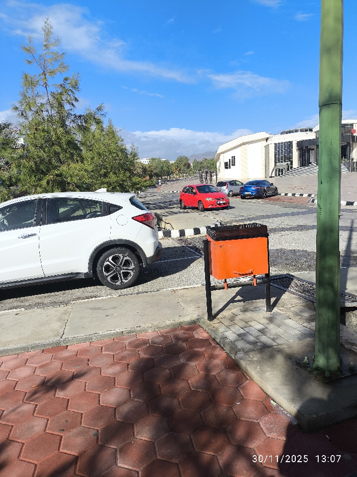 The image depicts an outdoor scene in Gönyeli, Northern Cyprus / Cyprus, captured on November 30, 2025, at 13:07. The foreground features a pedestrian area paved with red hexagonal interlocking pavers, partially shaded, adjacent to a concrete sidewalk. A white Honda HR-V SUV, with distinctive multi-spoke wheels, is parked facing left on the concrete. To its right, an orange, rectangular metal trash bin with a black liner is visible, mounted on a black metal frame. A vertical green pole occupies the far right of the frame. Beyond the sidewalk, an asphalt parking area is present, separated by black and white striped curbstones. Three vehicles are parked in this area: a red Mitsubishi Lancer sedan, a silver sedan positioned behind the red car, and a blue sports car/coupe further back. In the midground, various green trees are visible, including tall, slender evergreens. The background is dominated by a large, light-colored, modern-style building, likely institutional, featuring multiple windows and a prominent entrance with a wide set of steps. Distant hills or mountains are visible under a clear blue sky with scattered white clouds. No individuals are present in the frame. The scene is well-lit by direct sunlight, casting shadows towards the right and rear of the objects.