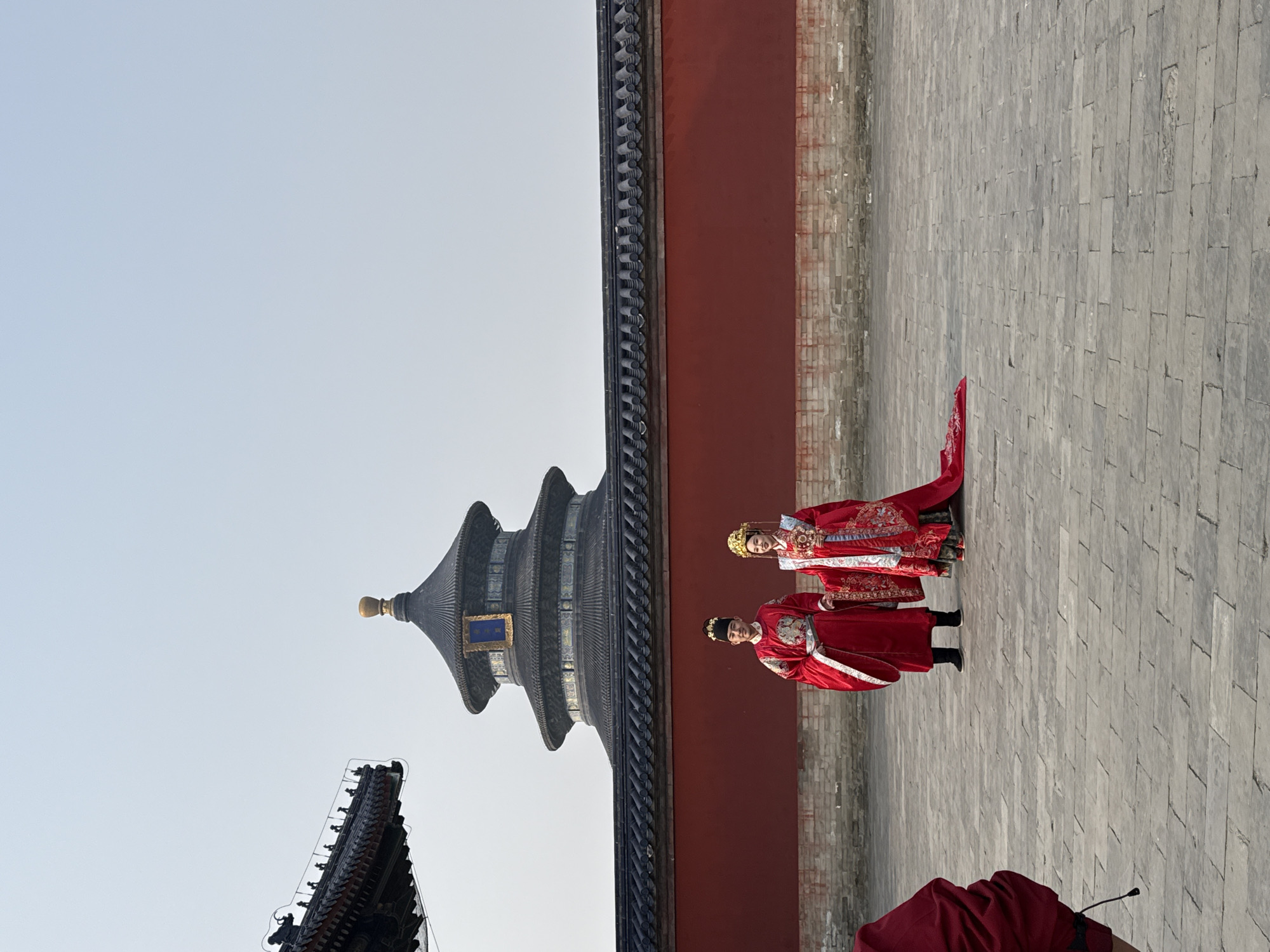 An outdoor scene is depicted at the Temple of Heaven, located in Dongcheng District, Beijing, China. The ground consists of an expansive, light grey paved courtyard laid with rectangular stone tiles. A prominent red wall, topped with dark grey, curved roof tiles, extends horizontally across the middle ground. Behind this wall, the circular, tiered dark grey roof of the Hall of Prayer for Good Harvests is visible, featuring a golden finial at its apex and a blue rectangular plaque on its side. In the upper left quadrant, the corner of another traditional Chinese dark-tiled roof structure is partially visible. In the center foreground, two individuals are standing, posed for a photograph. Both are dressed in elaborate, traditional Chinese red attire with extensive gold and silver embroidery, indicative of wedding garments. The individual on the left, likely a male, wears a red robe, a dark cap with gold ornamentation, and black shoes. His left hand holds a small, dark rectangular object. The individual on the right, likely a female, wears a more ornate red gown with a long train trailing behind her on the pavement. She features a large, intricate golden headdress and holds a circular red object with red tassels in her clasped hands at waist level. Both individuals face forward, looking slightly towards the viewer's right. Their expressions are neutral to mildly pleasant. A partial figure, clad in a red garment, is visible in the lower left corner, with a black strap or cord hanging down from their form. The sky overhead is a hazy, light grey.
