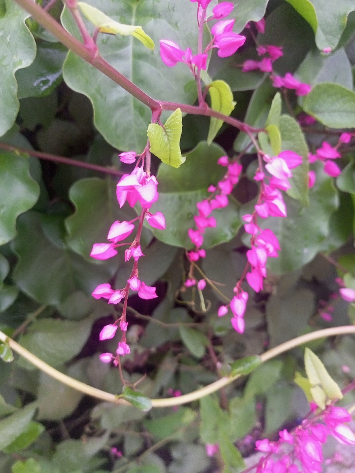 The image displays a close-up view of vibrant pink flowering vines and dense green foliage, situated in the city of Bamhori, India. Multiple clusters of small, fuchsia-pink flowers, predominantly in bud or partially opened, are suspended from slender, reddish-brown stems. These flowers exhibit a characteristic pointed shape. The background consists of numerous lush, dark green leaves with undulating or heart-shaped contours, appearing slightly out of focus and possibly moist, evidenced by subtle glistening. A distinct, curvilinear, lighter-colored vine or tendril, appearing yellowish-green, traverses the lower-middle portion of the frame. No human subjects, animals, or artificial structures are present within the scene. The environment is characterized by thriving, verdant plant growth.